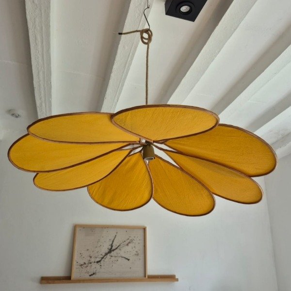 La pantalla es una estructura de mimbre y el pétalo está cubierto en tussor de color (a elección: mostaza, verde, rosa, natural, celadón, gris topo)